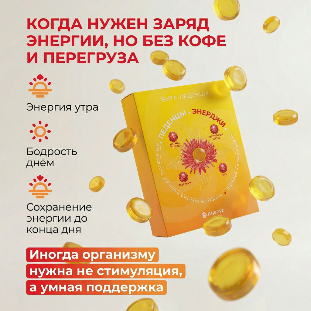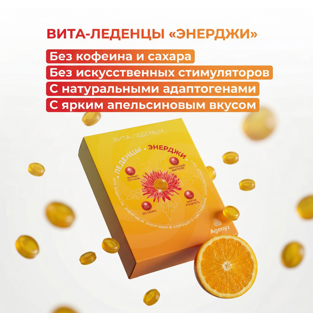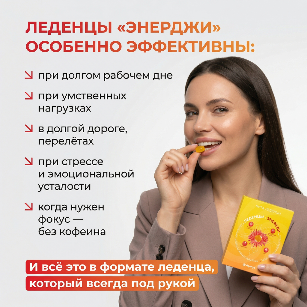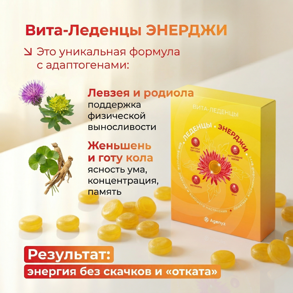 Вита-Леденцы ЭНЕРДЖИ — ваш природный заряд бодрости без кофеина и искусственных стимуляторов! Если вы устали от усталости и стресса, эти Вита-Леденцы для вас. Левзея и родиола розовая — это натуральные энергетики сибирских гор, которые дают стабильную энергию без «американских горок». Женьшень и готу кола разгоняют мозг, улучшая память и концентрацию. Энергия растёт плавно, потому что работает цепочка адаптогенов, а не мгновенный стимулятор.